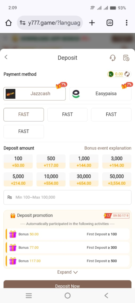 Deposit, Y777 Game